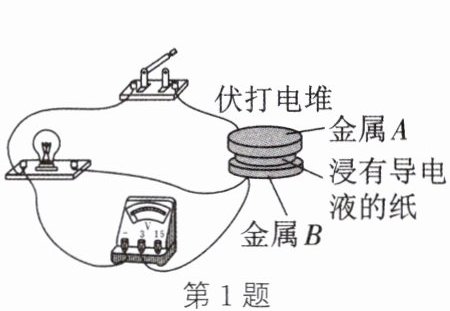 1. 小尧自制“伏打电堆”连接了如图所示电路,闭合开关,小灯泡发光,电压表指针右偏,金属B是电源的
