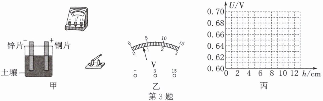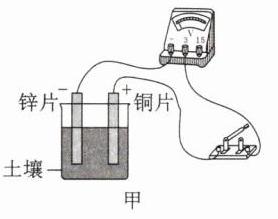 3. 某校研究性学习小组的同学,在网上浏览到一条信息:“微生物燃料电池”能利用土壤中的电解质获得电能,供给某种灯发光,如图甲所示,受此启发,他们用潮湿的土壤、铜片、锌片等制成了一个“土壤电池”,并测出有一定的电压,如图乙所示。那么“土壤电池电压的大小与哪些因素有关?”他们提出了以下猜想: