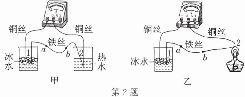 2. 如图甲,两种金属丝形成闭合回路,触头1置于冰水中,触头2置于热水中,回路中就会有电流通过,电流表指针向右偏转,这是温差电现象,这种电路叫热电偶。实验表明:热电偶电路中电流的大小跟相互连接的两种金属丝的材料有关;跟触头1和2间的温度差的大小有关,温度差越大,回路电流越大。请回答下列问题: