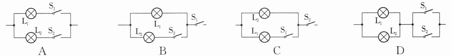 17. (2023·安徽)老师给小龙一个密封盒,其表面可见两个开关 $ S_1 $、$ S_2 $ 和两盏灯 $ L_1 $、$ L_2 $。为了探究开关和灯在密封盒内是如何连接的,小龙进行了如下操作:先闭合 $ S_1 $,只有灯 $ L_1 $ 发光;又闭合 $ S_2 $,两灯都发光;再断开 $ S_1 $,两灯都熄灭。符合上述实验结果的连接方式为(