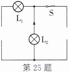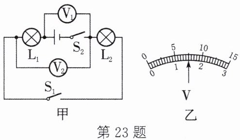 23. (2025·镇江丹徒模拟)如图甲所示电路中,当闭合开关 $ S_1 $ 和 $ S_2 $ 后,两个电压表的指针均如图乙所示,则灯泡 $ L_1 $ 和 $ L_2 $ 两端的电压分别为