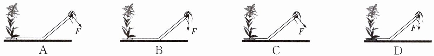 C [易错分析]根据杠杆的平衡条件确定最小力。拔草器相当于一个杠杆,若拔同一植株,则植株对拔草器的阻力一定,由杠杆平衡条件$F_{1}l_{1}=F_{2}l_{2}$可知,阻力臂越小,动力臂越大,则动力越小。
