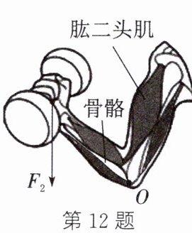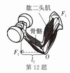 12. 如图所示,举着哑铃的前臂骨骼可看成杠杆,画出动力$F_1$的示意图及阻力$F_2$的力臂$l_2。$