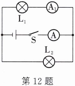 12. 如图所示的电路中,电源电压保持 6 V 不变,灯$L_{2}$的电阻是 10Ω,闭合开关 S,电流表$A_{1}$的示数是 0.3 A,不考虑温度对灯丝电阻的影响,求: