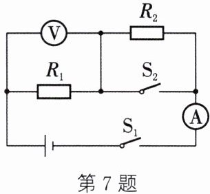 7. 如图所示,电源电压保持不变,闭合开关$S_{1}$、$S_{2}$,电压表示数为6V,电流表示数为0.6A,断开$S_{2}$后,电流表示数变为0.2A。求: