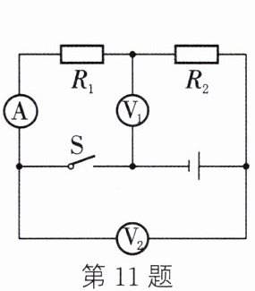 11. 如图所示,$R_{1}= 10Ω$、$R_{2}= 20Ω$,闭合开关S后,电压表$V_{1}$的示数为1V,则电流表A的示数应为