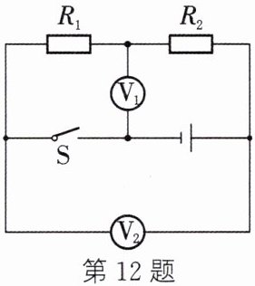 12. 如图所示,电阻$R_{1}$为3Ω,$R_{2}$为1Ω。当开关S闭合后,通过电阻$R_{1}$、$R_{2}$的电流之比为