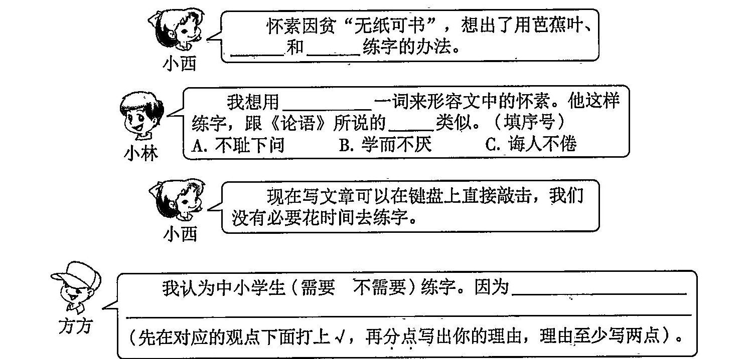 2. 情境学习 读着《怀素练字》一文,同学们展开以下对话,请把对话补充完整。(6 分)