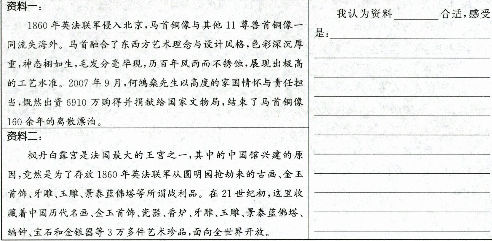 5. 雨果曾经在书信中写下:“法兰西帝国侵吞了一半宝物,现在,它居然无耻到这样的地步,还以所有者的身份把圆明园的这些美轮美奂的古代文物拿出来公开展览。”为了印证这一事实,小睿搜集到了以下两份资料,你觉得哪份资料合适?“少年强则国强”,作为当代中国少年,请在右侧写下你读完资料后的感受。(4分)