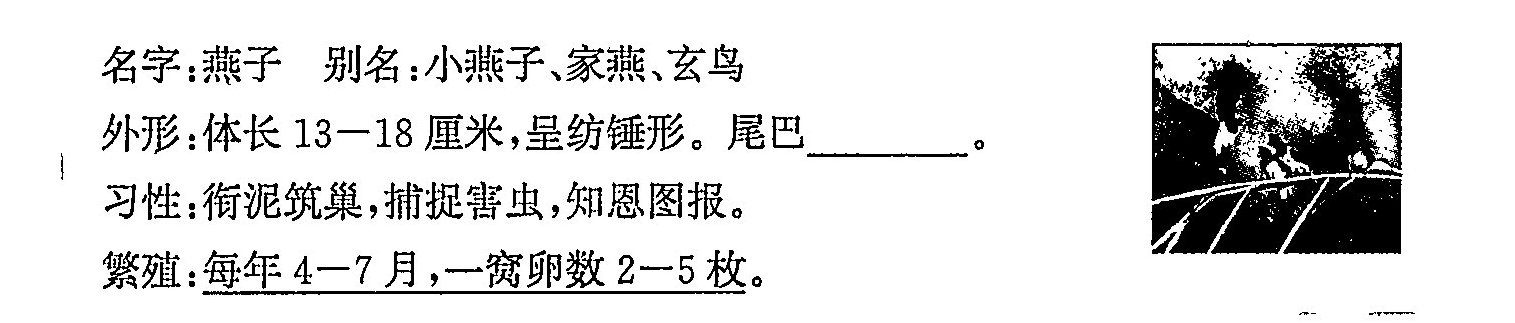 三、小语特别喜欢燕子,他和同学小文为燕子制作了“名片”,请你完成练习。(5分)