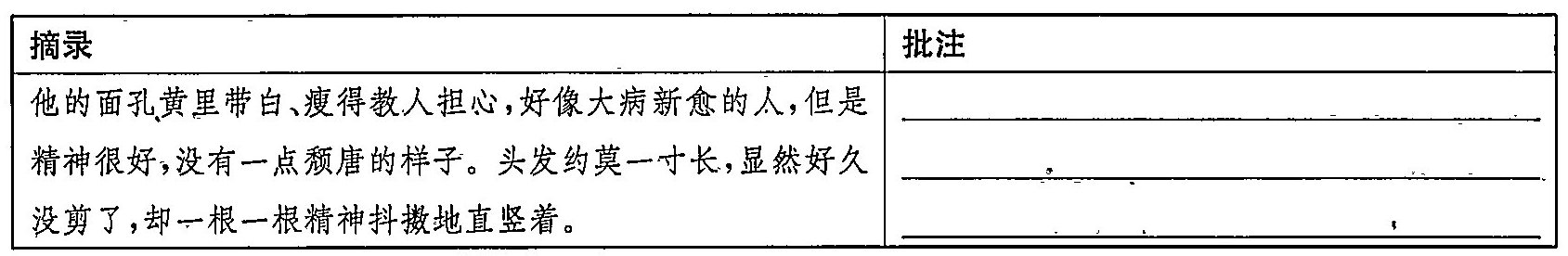 他的面孔黄里带白,瘦得教人担心,好像大病新愈的人,但是精神很好,没有一点颓唐的样子。头发约莫一寸长,显然好久没剪了,却一根一根精神抖擞地直竖着。胡须很打眼,好像浓墨写的隶体“一”字。