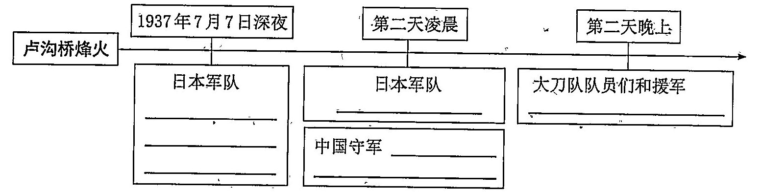⑤当天晚上,大刀队员们手握大刀,腰佩手榴弹,又悄悄地向卢沟桥进发。到了桥头,大刀队员们齐声呐喊:“小鬼子,看刀!”日寇猝不及防,一个个人头滚落,尸横桥头。这