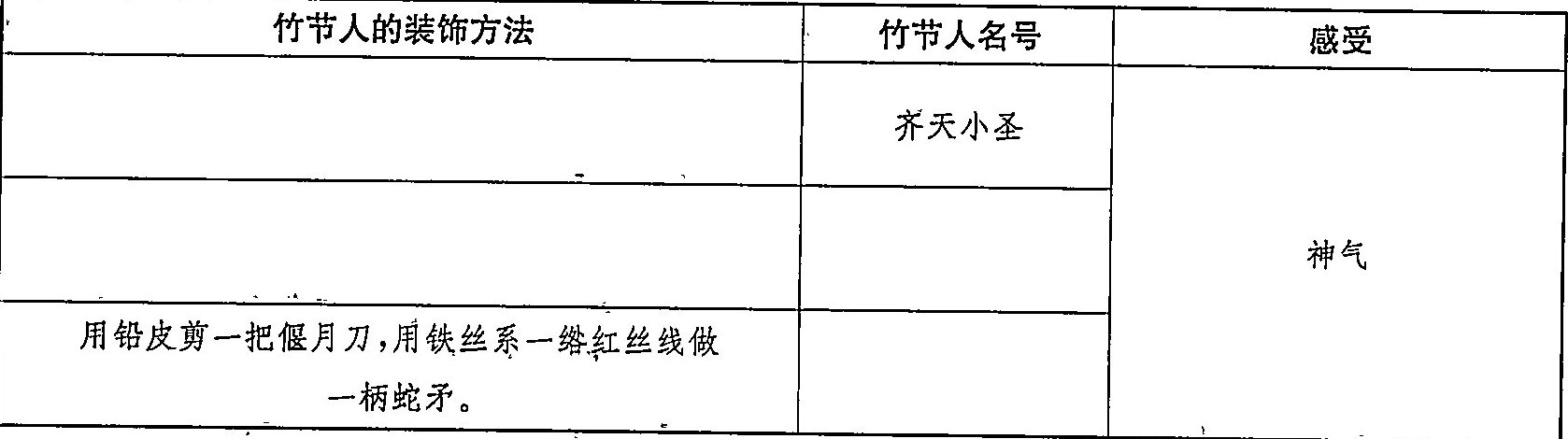 ①竹节人手上系上一根冰棍棒,就成了手握金箍棒的孙悟空,号称“齐天小圣”,四个字歪歪斜斜在竹节人背上,神气!