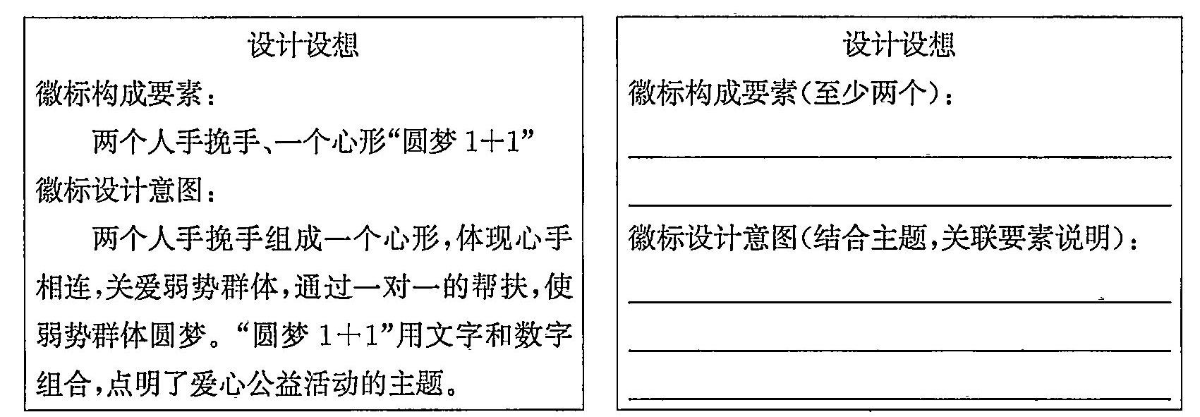 4. 本次环保宣传活动需要设计一个徽标(logo)。结合上述材料,参考“圆梦 1+1”活动徽标的设计设想,把本次活动的设计构想写下来。(6 分)