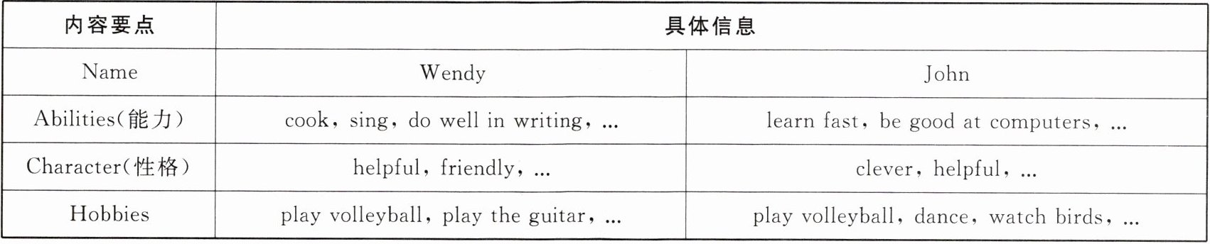 | Abilities(能力) | cook,sing,do well in writing,... | learn fast,be good at computers,... |