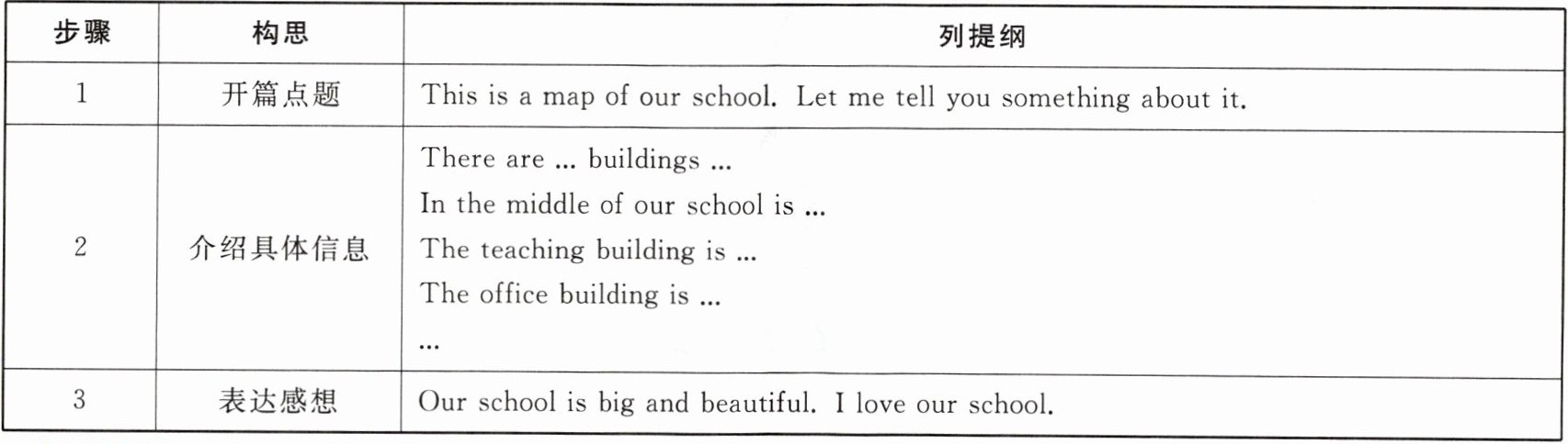 | 3 | 表达感想 | Our school is big and beautiful. I love our school. |