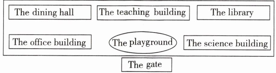Our school is Green Middle School. 2. ______(我们学校有5幢建筑物). They are a science building,an office building,a teaching building,a dining hall and a library. 3. ______(操场在学校的中间). On the left of it is the science building. Behind the science building is the office building. Between the office building and the dining hall is the teaching building. 4. ______(食堂前面是图书馆). There are 30 classes,80 teachers and about 1,200 students.