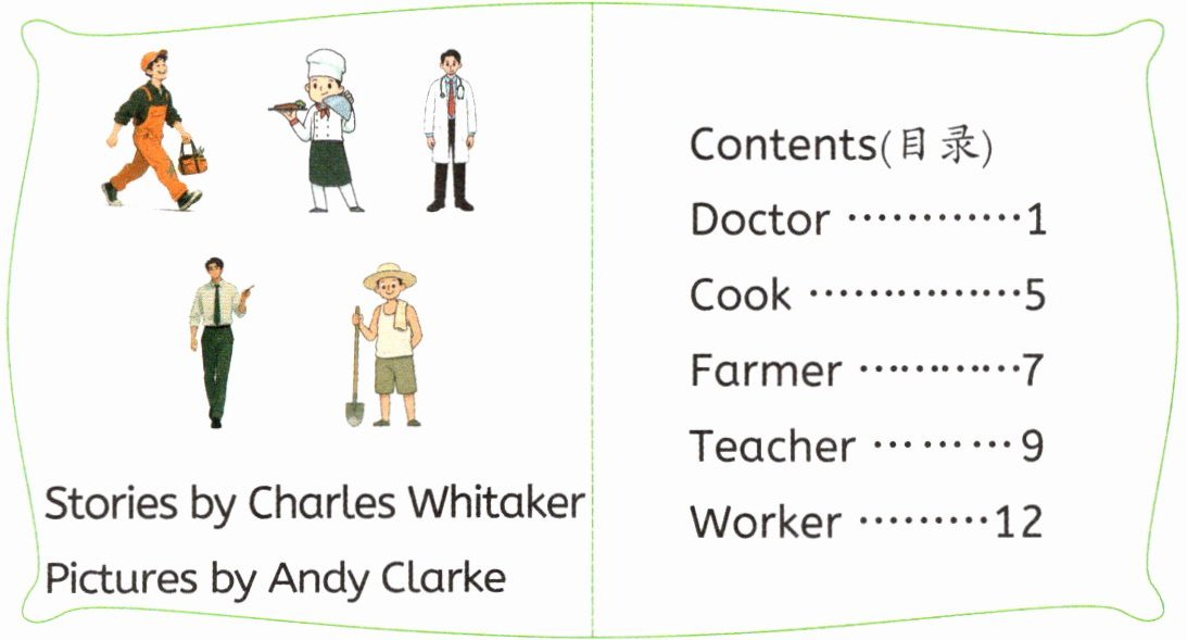 | Stories by Charles Whitaker Pictures by Andy Clarke | Contents(目录) Doctor …………1 Cook …………5 Farmer …………7 Teacher …………9 Worker …………12 |