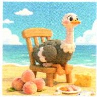 Do you know the ostrich(鸵鸟)? She is from China. She likes to play with children. She is on the beach(沙滩). She likes to touch. What's for lunch? She eats some peaches. She eats some cheese(芝士). She eats some fish. Oh, she eats too much.