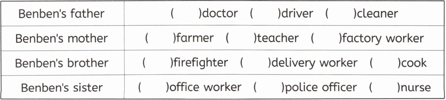 | Benben's father | ( )doctor ( )driver ( )cleaner |