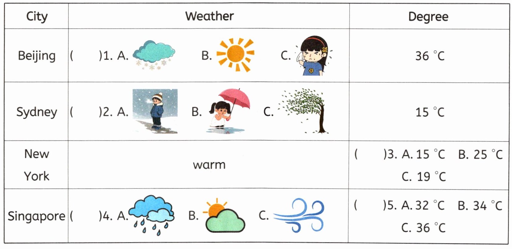 | New York | warm | ( )3. A. 15°C B. 25°C C. 19°C |