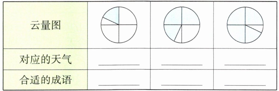 ⑪〔思维创新〕气象学家区分晴、多云和阴的标准如下:把天空当成一个圆面,平均分成4份,把看到的云量填充到这个圆面内,如果云量不超过圆面的$\frac{1}{4}$,那么就是晴天;如果云量超过$\frac{1}{4}但不超过\frac{3}{4}$,那么就是多云;如果云量超过$\frac{3}{4}$或覆盖了整个圆面,那么就是阴天。请根据这个标准,在云量图标下方写上对应的天气,并选择形容这种天气的对应的成语。(图中填色部分表示云量)