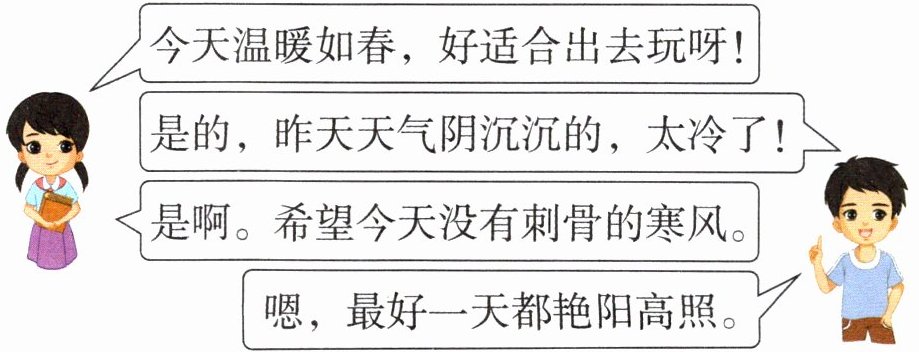 ⑥如图所示为小西和小杭谈论天气的一段对话,请你在描述天气的词语下面画线。