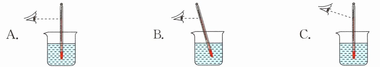 2 在厨房内使用温度计测量水温时,下列有关温度计的使用和读数方法的示意图,正确的是( )。
