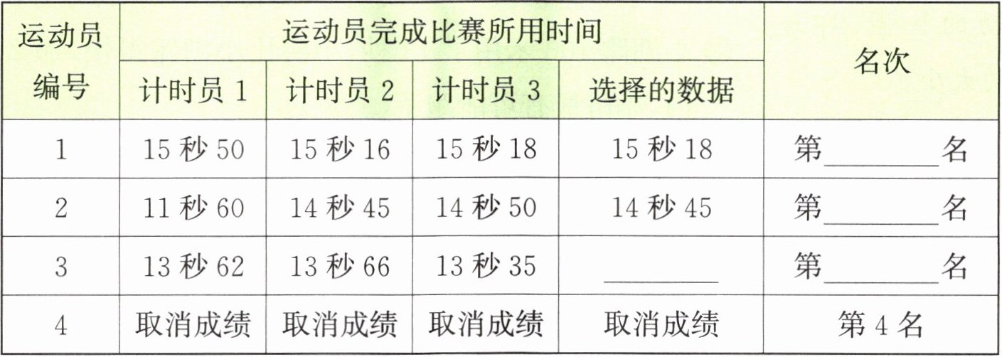 (2)此次百米赛跑有3名计时员,三个成绩中,上表选用的是( )。