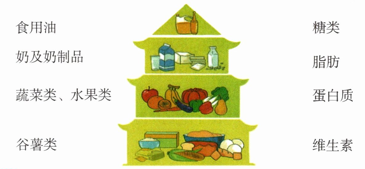 6 如图所示为“6~10 岁学龄儿童平衡膳食宝塔”,请将“宝塔”中的层级与其所含的主要营养成分用线连起来。