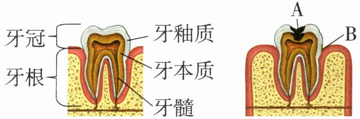 4 对比观察健康牙和龋病牙,在横线上填写对应字母所代表的龋病。