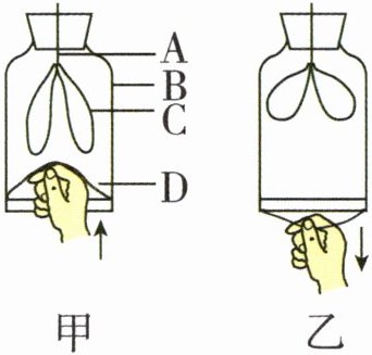 ③我们研究呼吸时可以借助模型,如图所示为演示呼吸过程的模型图。图中代表肺的是______(填字母),代表膈肌的是______(填字母),其中______(填“甲”或“乙”)模拟的是人体的吸气过程,吸气时气体的流动方向是______(填“A→C”或“C→A”)。