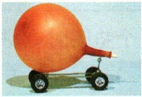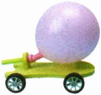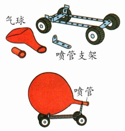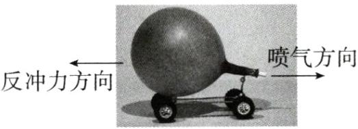 3 如图所示为小科在科技节上设计并制作的一辆气球小车,请用带箭头的直线标出该车喷气的方向与反冲力的方向。