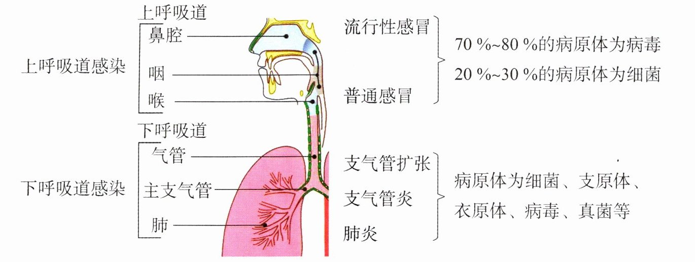 11 [思维拓展]呼吸道感染是一种常见的疾病,包括鼻、咽、喉、气管、支气管及肺部的感染性炎症,以喉为界,分为上呼吸道感染和下呼吸道感染。呼吸道感染主要表现为发热、咳嗽、咳痰、呼吸困难等。如图所示为目前科学上对此的相关说明。