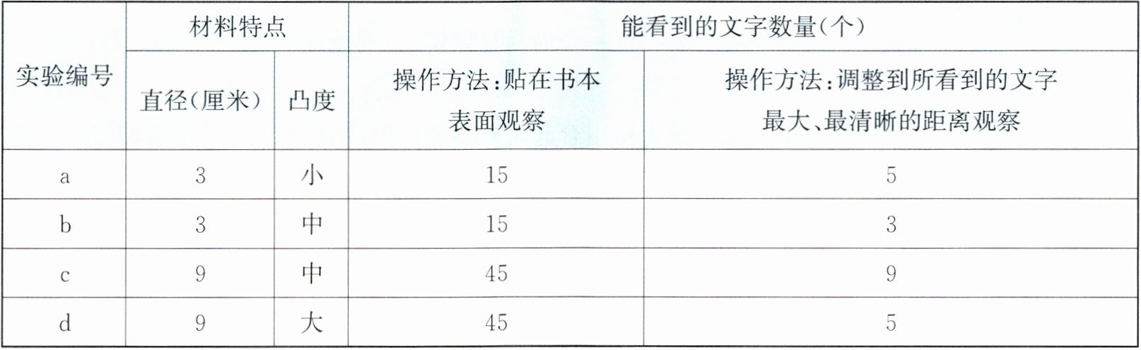 ⑨ 小科用自制的放大装置看报纸,发现用每一种装置观察相同文字的放大效果都不同,相关实验数据如表所示,请根据记录表回答下列问题。
