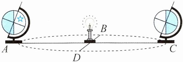 ⑬ 如图所示,将一盏电灯放在桌面中心代表太阳,用一个地球仪代表地球,将地球仪以电灯为圆心,在桌面上沿虚线转一圈,用来模拟某种自然现象。