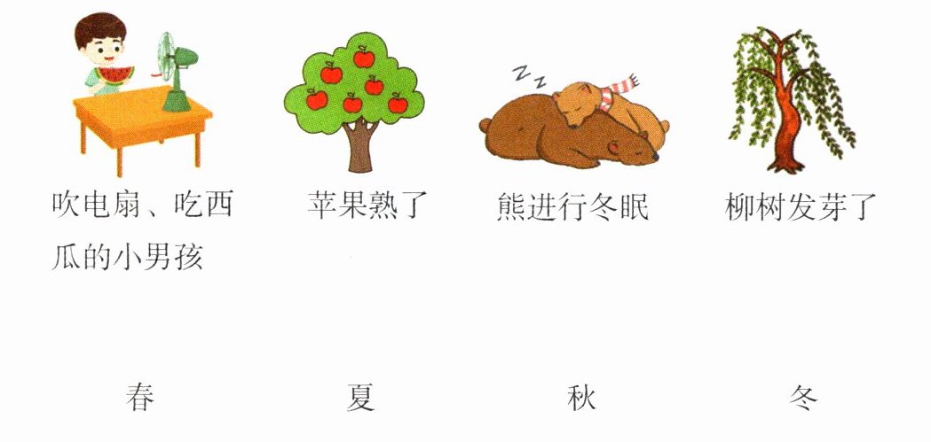 吹风扇、吃西瓜的小男孩—夏;苹果熟了—秋;熊进行冬眠—冬;柳树发芽了—春