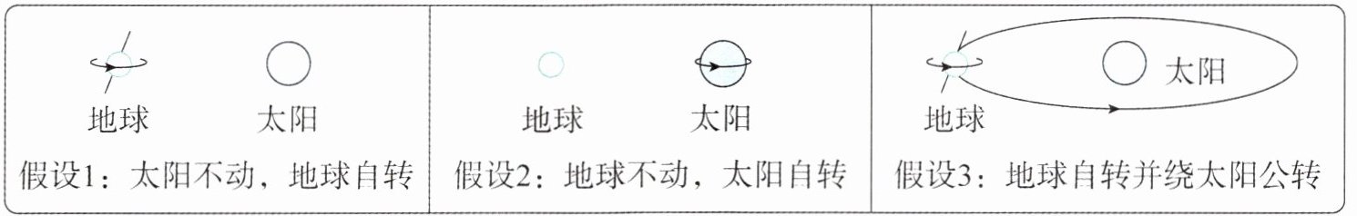 |假设1:太阳不动,地球自转|假设2:地球不动,太阳自转|假设3:地球自转并绕太阳公转|