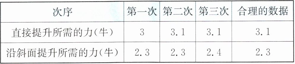 | 沿斜面提升所需的力(牛) | 2.3 | 2.3 | 2.4 | 2.3 |