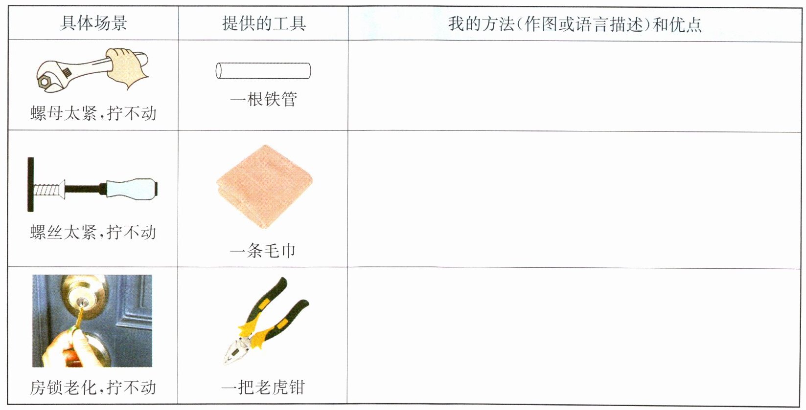 将铁管套在扳手上,延长扳手长度,然后转动铁管;增大轮,可以更省力 用毛巾紧紧包裹住螺丝刀,然后转动;增大轮,可以更省力,并增大摩擦力,不易打滑 将老虎钳夹住钥匙,然后转动老虎钳;增大轮,可以更省力