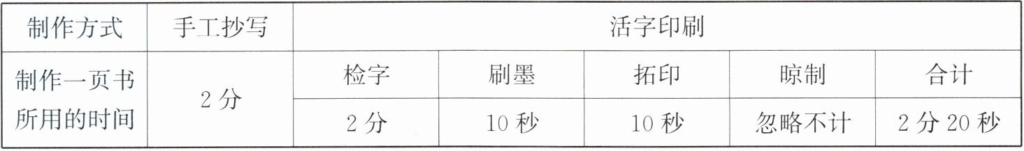 7 〔学科融合〕如表所示为某同学采用手工抄写和活字印刷两种方式制作一页书所用的时间。