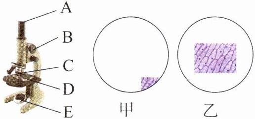 (2)小杭在显微镜下做观察洋葱表皮细胞玻片标本的实验。实验中需要将镜筒下降,眼睛应该注视____(填字母)。图甲是他观察到的洋葱表皮细胞,若要将观察到的视野从图甲调整到图乙,应将玻片标本向____移动。