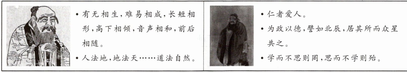 (1)老子:一切事物都有对立面;对立的双方能够互相转化;从正反两方面思考问题;顺应事物内在规律来行事等。孔子:提出“仁”“为政以德”;主张学思结合等。