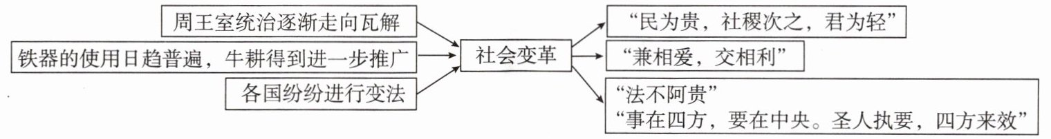 论述:战国时期是我国社会大变革时期。这一时期,周王室统治走向瓦解,大国兼并;随着铁器的使用日趋普遍,牛耕得到进一步推广,农业生产得到进一步发展,各诸侯国实力增强。为了在兼并战争中取胜,各国纷纷变法以求富国强兵。面对这一形势,各学派提出各种政治主张希望用自己的学说解决社会问题。儒家学派孟子认为得民心者得天下,墨子主张“兼爱”“非攻”,法家强调法律的作用,强化中央集权专制统治。各个学派对于大变革的社会提出各自主张,促进了思想的繁荣。