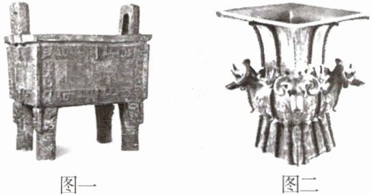 (1)写出材料一中图一、图二青铜器的名称。根据所学知识,从制作工艺和象征意义两个角度概括它们的共同点。(4分)