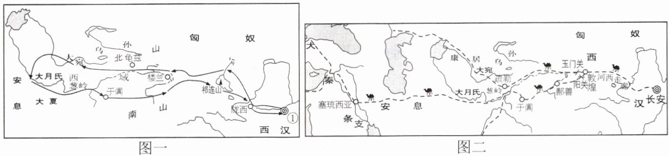 11.(1)长安 欧洲。事件:图一——张骞出使西域,图二——丝绸之路开辟。关系:张骞开辟通往西域的道路后,汉朝和西域的使者、商人相互往来,开辟了沟通欧亚的陆上交通道路,即“丝绸之路”。