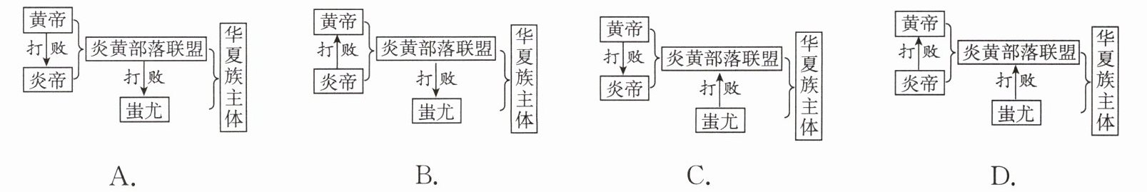 8. 下列关于炎帝、黄帝与蚩尤三个部落的发展演变历程示意图,正确的是 ( )