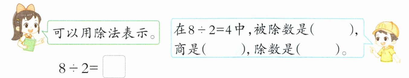 在8÷2= 4中,被除数是( ),商是( ),除数是( )。