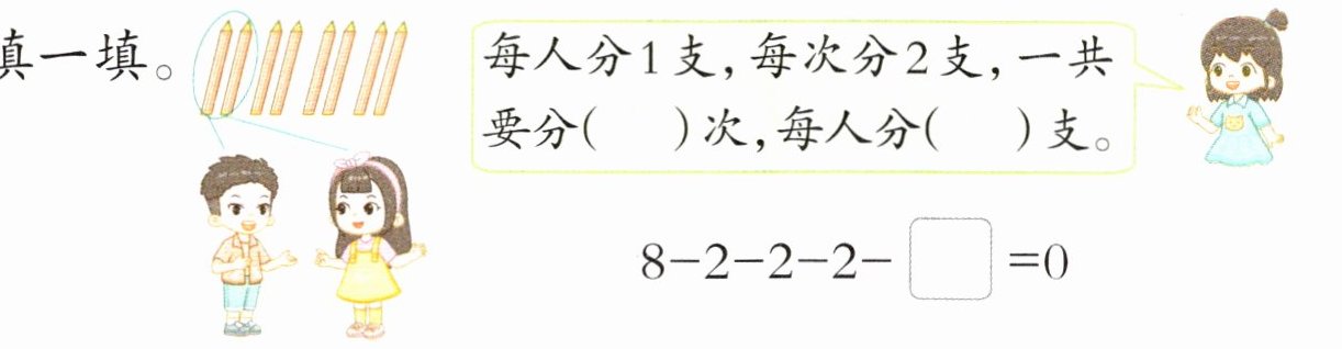 1. 把8支笔平均分给2个小朋友,每人分( )支。分一分,填一填。