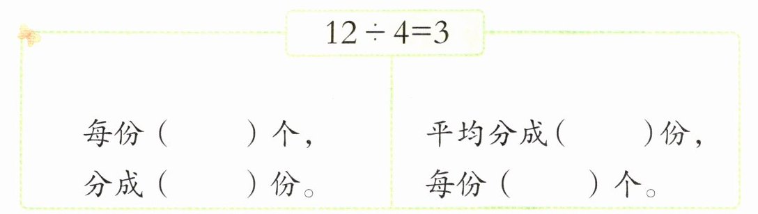 12÷4= 3 每份( )个,分成( )份。平均分成( )份,每份( )个。